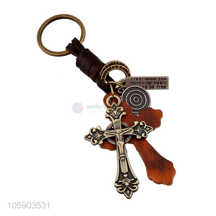 Promotional cheap retro alloy cross pendant weaving leather key chain