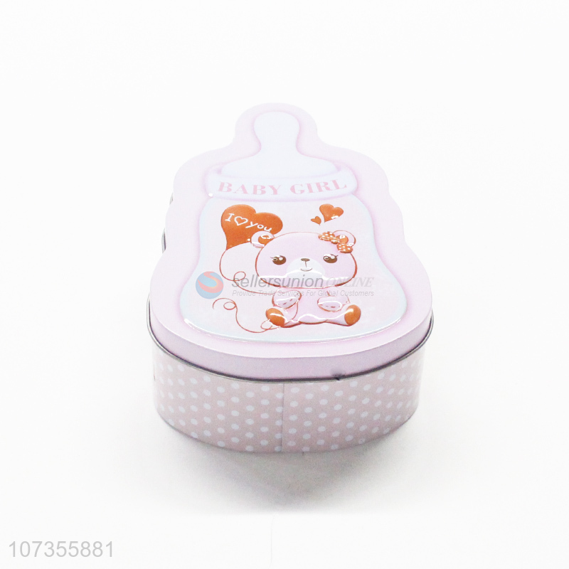 Factory price feeding-bottle shape iron food storage can tin candy jar