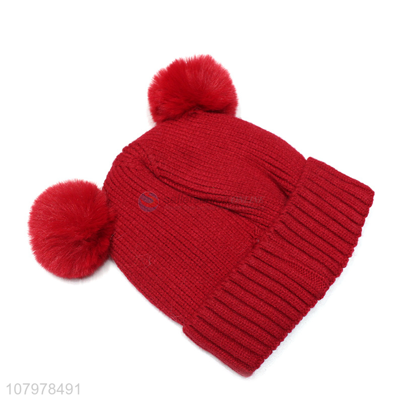 Wholesale kids fleece lined beanies winter jacquard hat with double pompoms