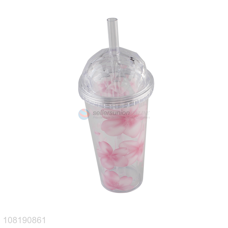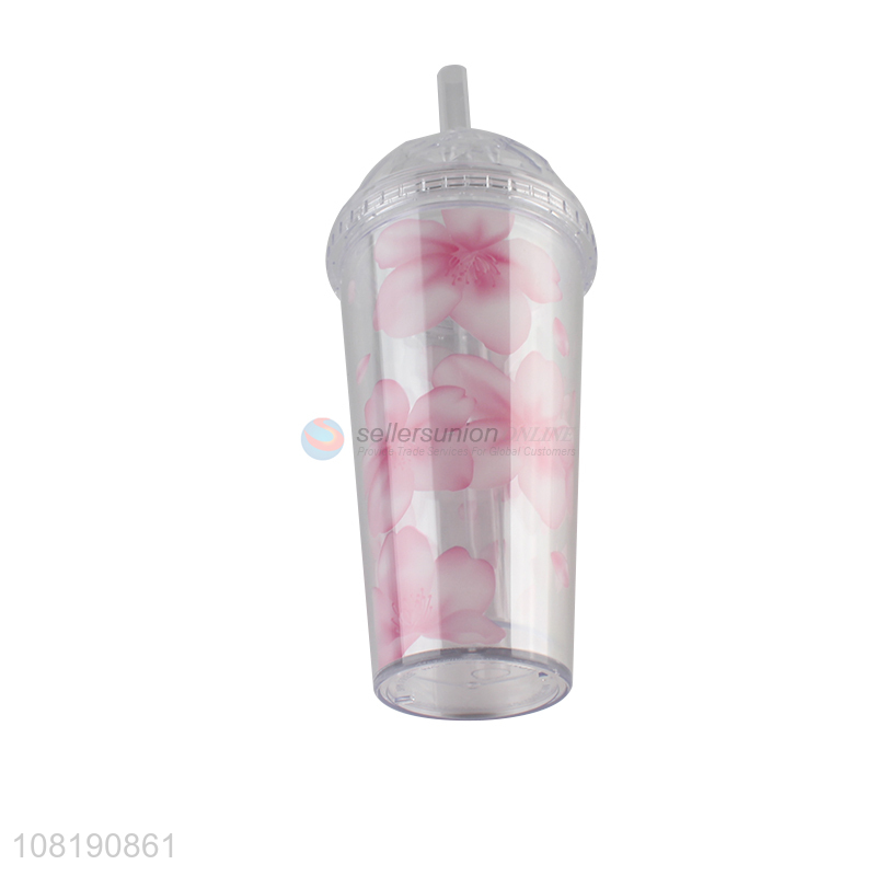 • Wholesale double walls floral print plastic water cup with straw